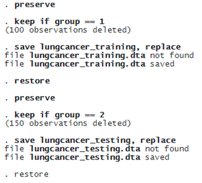 For later use, we save the training data as lungcancer_training.dta and the testing data as lungcancer_testing.dta.